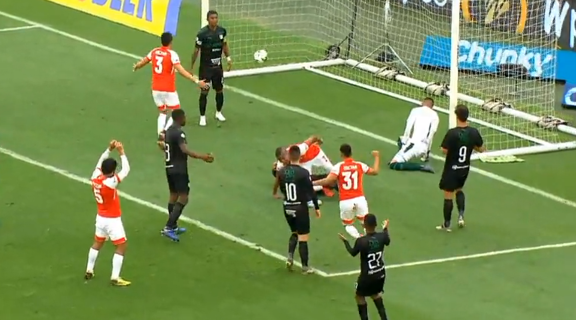 Tras lanzamiento desde la derecha de Juan Camilo Ángulo al área, impacto de Dineno y cuando el balón iba camino de arco pego en la pierna de Arboleda.