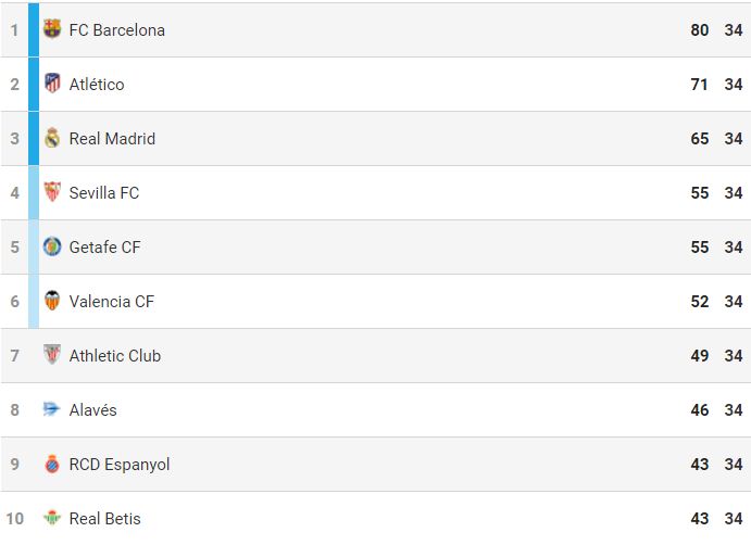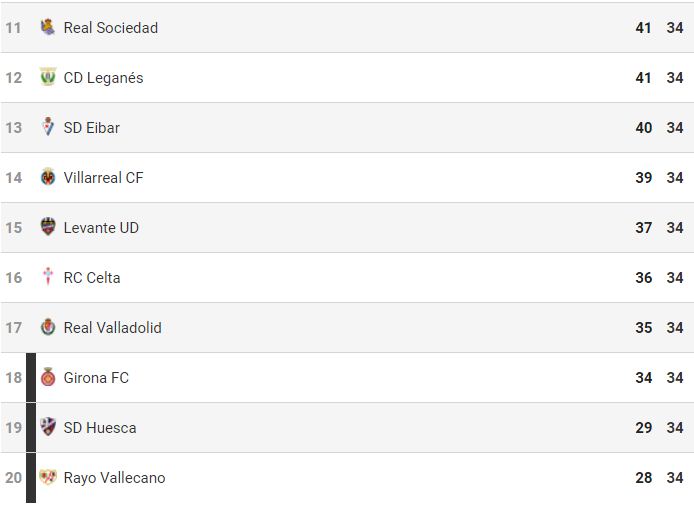 En la jornada del martes el Barcelona dio un paso más hacia el título tras ganar a un Alavés que ya tiene el trabajo hecho en Mendizorroza. Los hombres de Valverde necesitan tres puntos para cantar el alirón. Por otro lado, el Huesca se agarra al sueño de la salvación tras vencer al Eibar y el Valladolid coge aire al mismo tiempo que mete al Girona en el lío. Los catalanes terminan la jornada 34 en puestos de descenso.