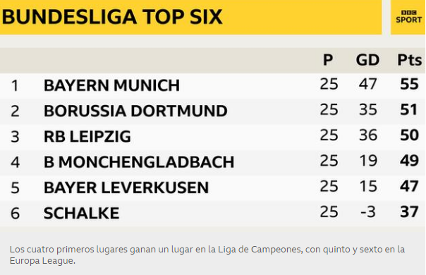 Borussia Dortmund, RB Leipzig y Borussia Monchengladbach están a seis puntos de los campeones.