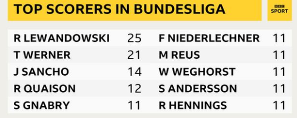 El máximo goleador de la liga es el mejor número nueve del mundo: Robert Lewandowski. El delantero del Bayern de Múnich y Polonia ha marcado 39 goles en 33 apariciones para su club esta temporada.