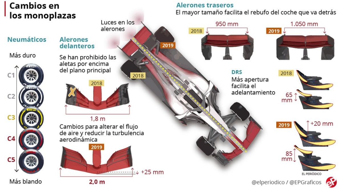Con el objetivo de facilitar los adelantamientos, los equipos acordaron una serie de cambios aerodinámicos que afectan al perfil de los alerones delantero y trasero. Son más anchos, altos y simples.
